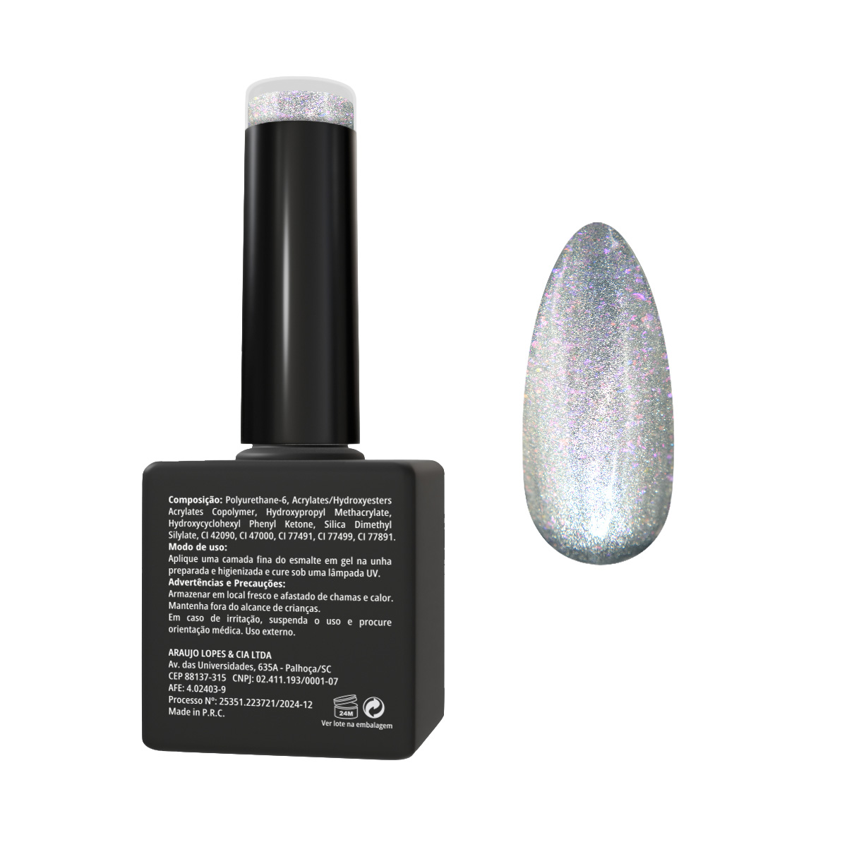 Um prata translúcido sofisticado, iluminado por reflexos multicoloridos, onde o rosa se destaca como tonalidade principal em contraste delicado com nuances roxas sutis. Essa combinação cria um efeito magnético único, perfeito para composições femininas, glamourosas e modernas.