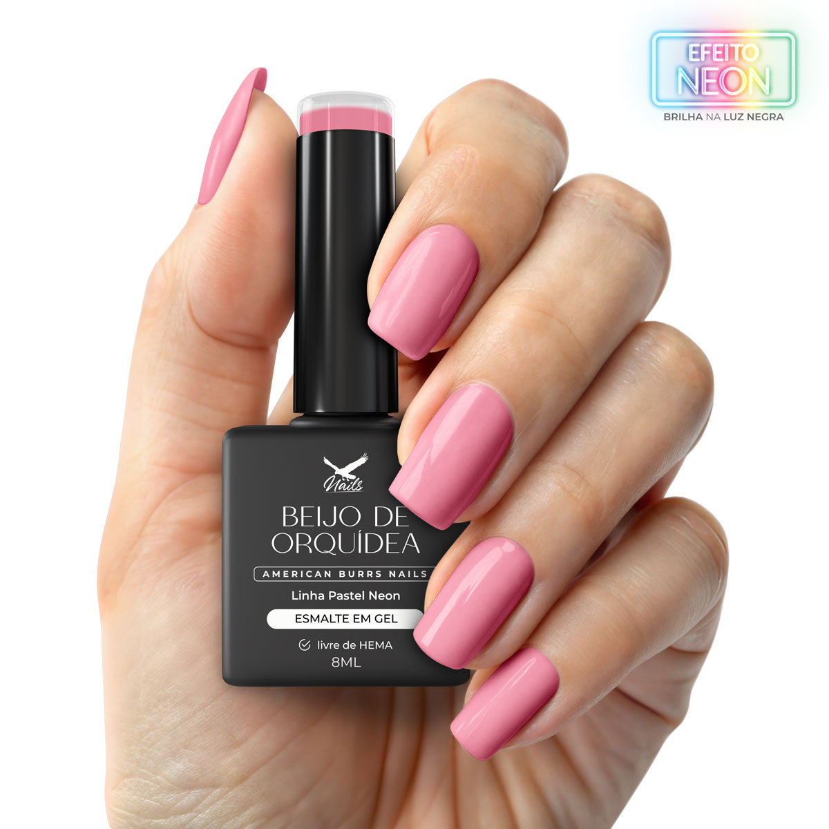 – Rosa pastel com fundo vibrante e alegre. Um tom feminino e expressivo, perfeito para nail arts românticas. Possui brilho sob luz negra.