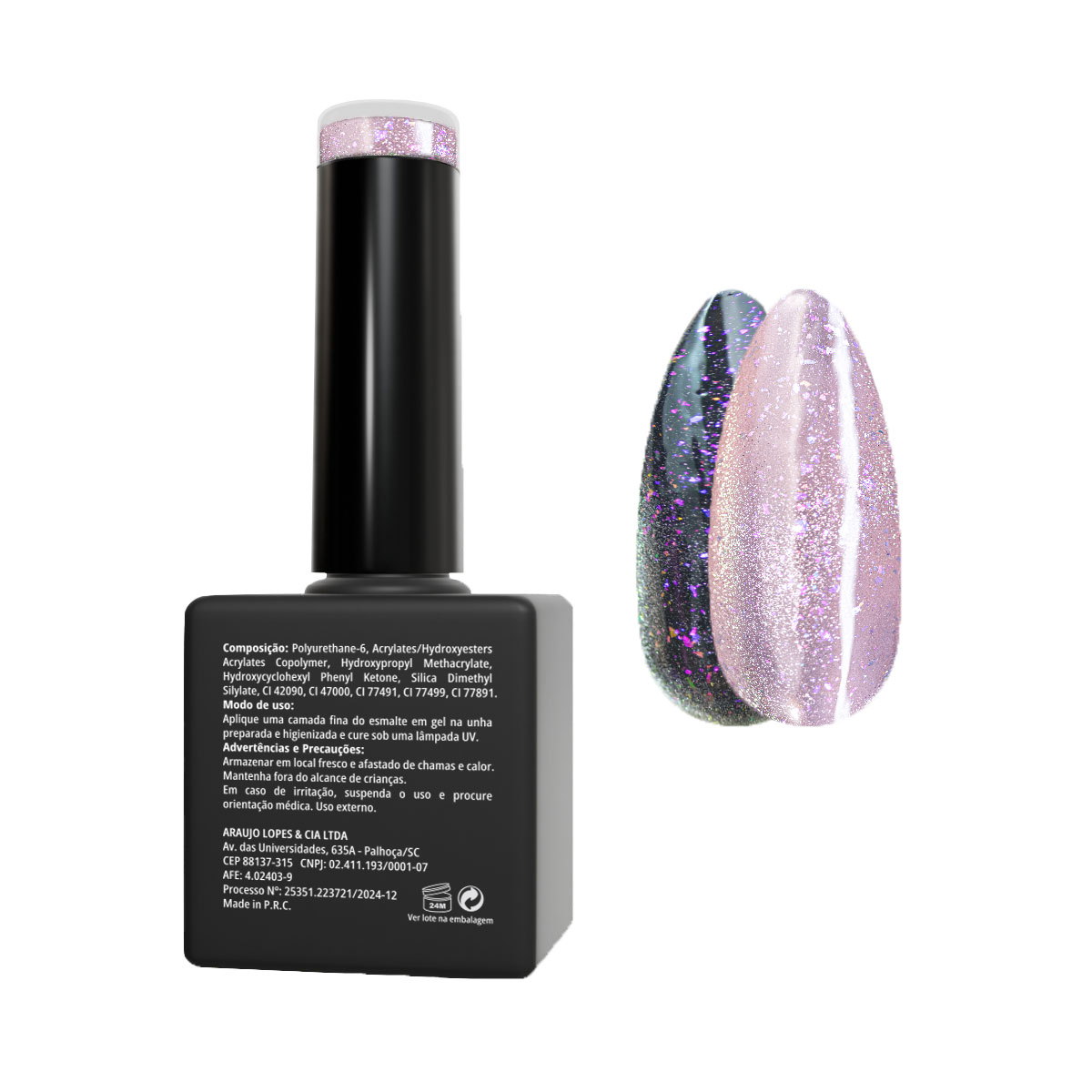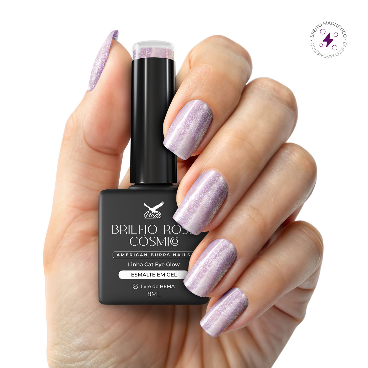 Sobre a cor – Brilho Rosé Cósmico: Um brilho delicado em tom rosé claro, com finas partículas de glitter. O efeito magnético cria um feixe de luz rosado-prateado suave. Lindo sobre bases claras para um toque sutil, ou sobre bases escuras para um contraste luminoso e diferente.