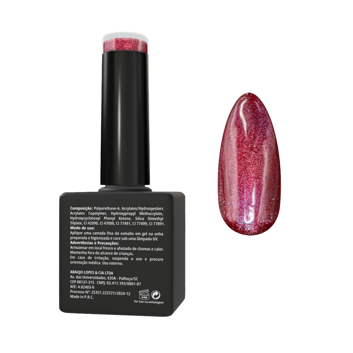 Vermelho carmim metálico com reflexos magnéticos prateados. Esmalte em gel efeito Cat Eye, livre de HEMA, TPO e TMTPA, que permite criar efeitos tridimensionais exclusivos com o uso do ímã antes da catalisação.