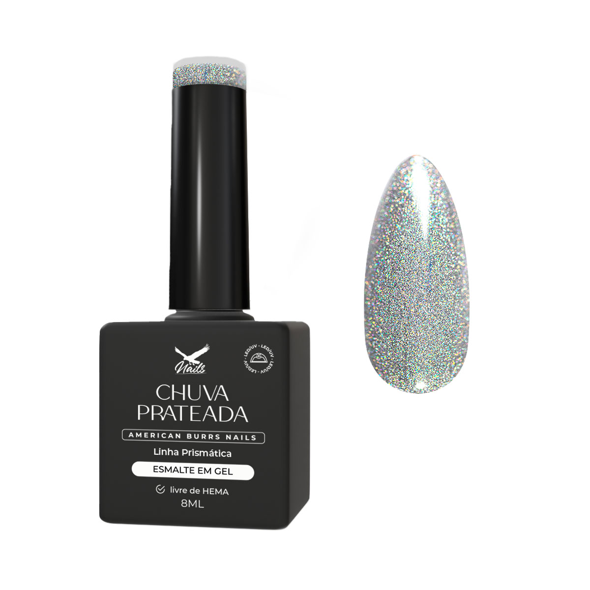 Chuva Prateada: Um prateado reluzente com partículas de glitter que criam um efeito prismático sutil e elegante.