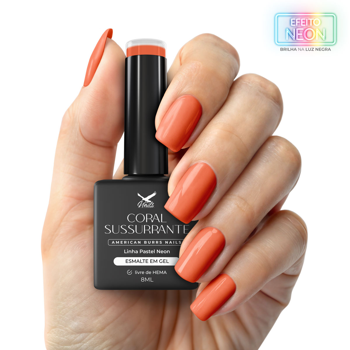 Laranja coral vibrante com toque suave. Um tom alegre e quente que ilumina qualquer composição. Possui brilho sob luz negra.