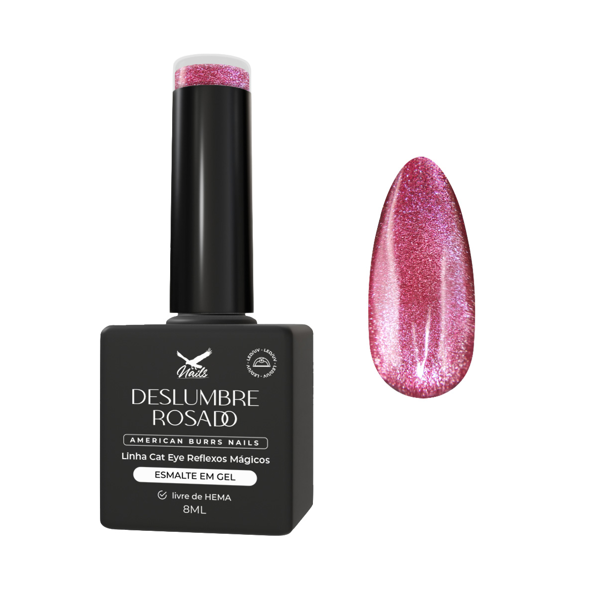 A Linha Cat Eye Reflexos Mágicos da American Burrs Nails foi criada para proporcionar um efeito tridimensional impressionante e sofisticado em cada esmaltação. Com tecnologia magnética inovadora, o efeito é ativado pelo uso do ímã antes da catalisação em cabine UV/LED, possibilitando combinações exclusivas e artísticas.