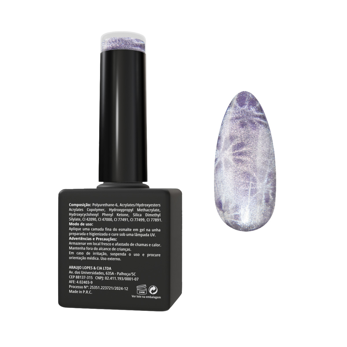 Lilás suave cintilante com reflexos magnéticos perolados. Esmalte em gel efeito Cat Eye, livre de HEMA, TPO e TMTPA, que pode ser usado puro ou sobre outra base, criando efeitos exclusivos que variam conforme o fundo escolhido.