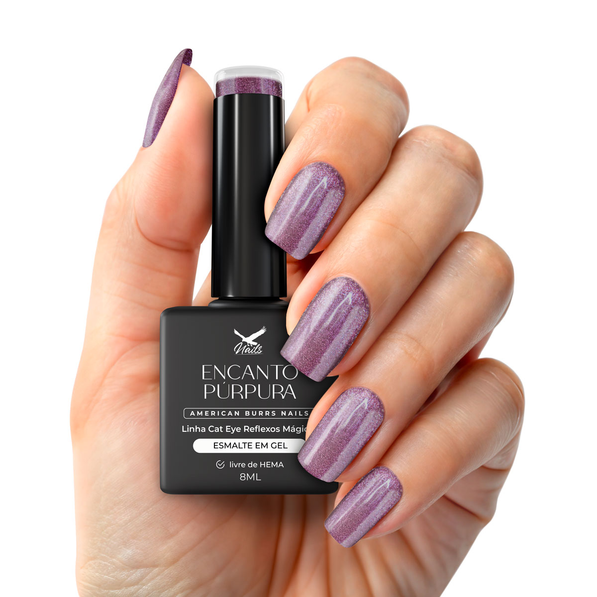 Encanto Púrpura: Um roxo místico e profundo enriquecido por partículas metálicas que, ao serem ativadas com o efeito Cat Eye, revelam profundidade e um brilho magnético hipnotizante. Uma cor luxuosa e intensa, perfeita para nail arts criativas, designs ousados e esmaltações elegantes que exigem presença e sofisticação em qualquer ocasião.