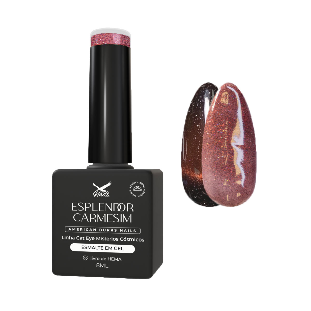 Sobre a cor – Esplendor Carmesim: Partículas magnéticas que irradiam tons quentes de carmesim profundo, vermelho-acastanhado e cobre. Sobre a base preta recomendada, o efeito revela um esplendor intenso e profundo, como uma brasa cósmica acesa na escuridão.