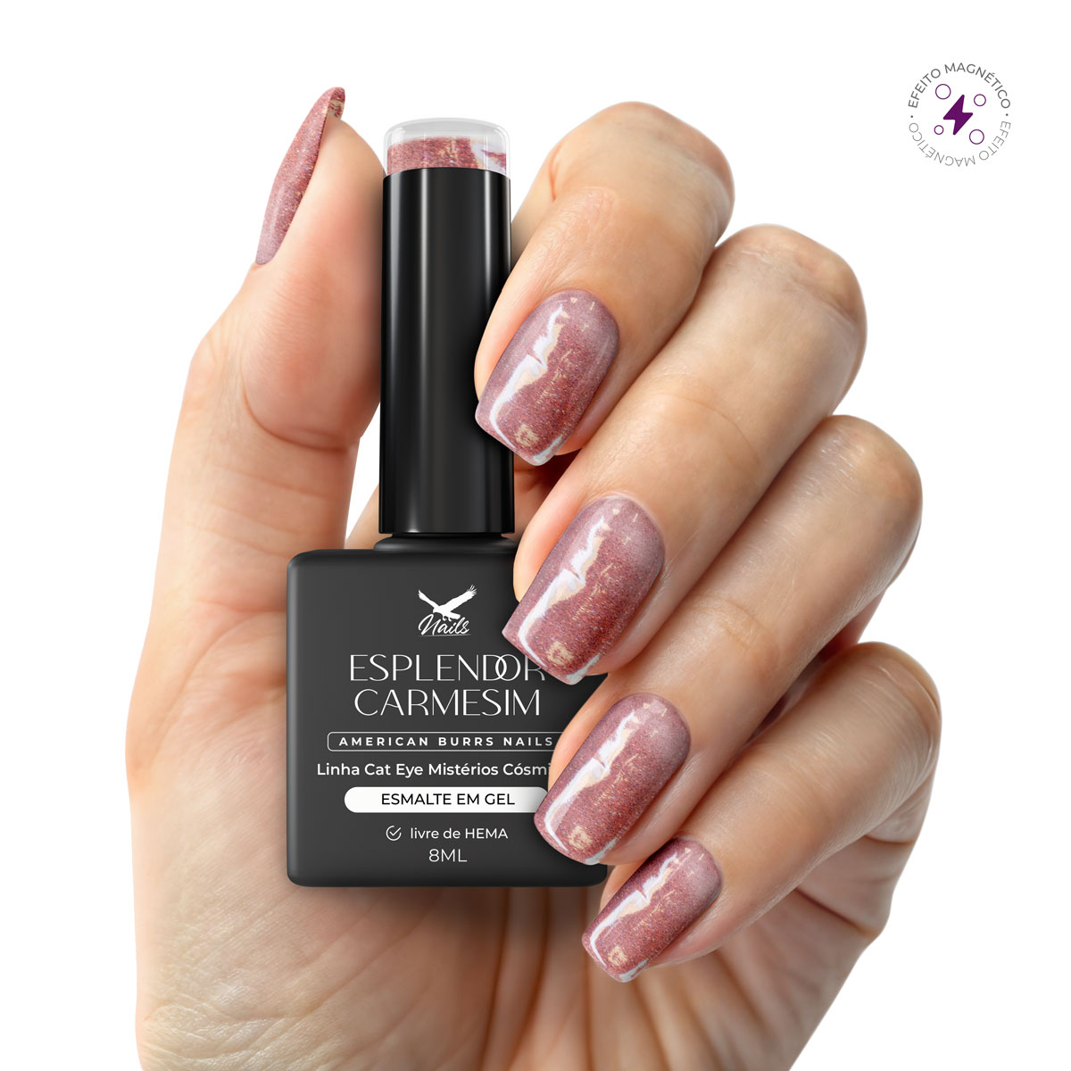 Imagem meramente ilustrativa. As cores dos produtos podem sofrer alterações de acordo com o lote, as condições de iluminação no momento da foto ou a configuração da sua tela. O efeito Cat Eye pode variar conforme a técnica de aplicação do ímã e a cor de base utilizada.