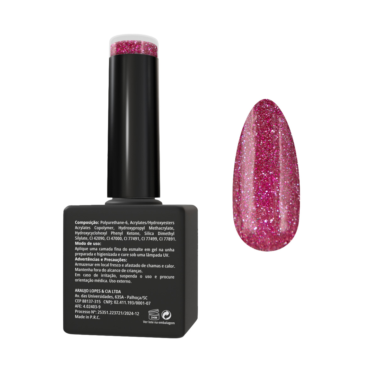 Rosa vibrante com partículas reflexivas cristalinas. Esmalte em gel de alta performance, livre de HEMA, TPO e TMTPA, com aplicação autonivelante, segurança máxima e brilho festivo intenso desde a primeira camada.