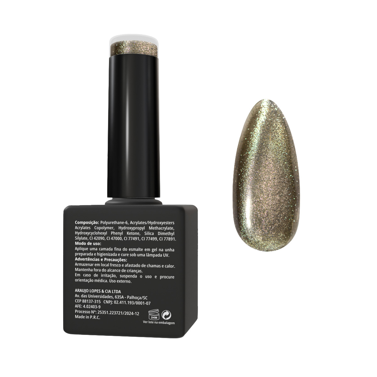 Prata champagne sofisticado com reflexos magnéticos cristalinos. Esmalte em gel efeito Cat Eye, livre de HEMA, TPO e TMTPA, que possibilita criar efeitos tridimensionais exclusivos com o uso do ímã antes da catalisação.