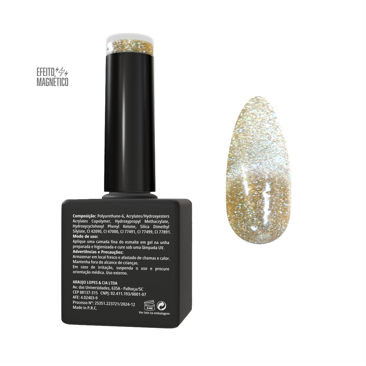 Dourado luxuoso com efeito Cat Eye magnético e partículas reflexivas. Esmalte em gel de alta performance, livre de HEMA, TPO e TMTPA, com aplicação autonivelante, segurança máxima e brilho reluzente ativado com ímã.
