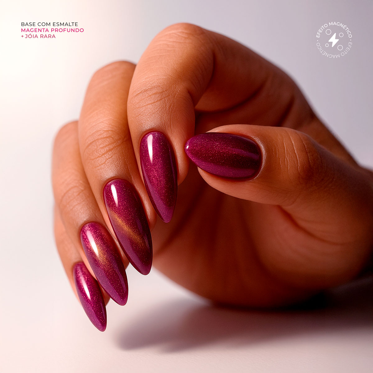 Sobre a cor – Jóia Rara: Como uma gema preciosa, este gel contém partículas magnéticas que, sobre a base preta recomendada, revelam um brilho intenso que transita entre tons quentes de rosa acobreado, cobre e dourado, com profundidade misteriosa.