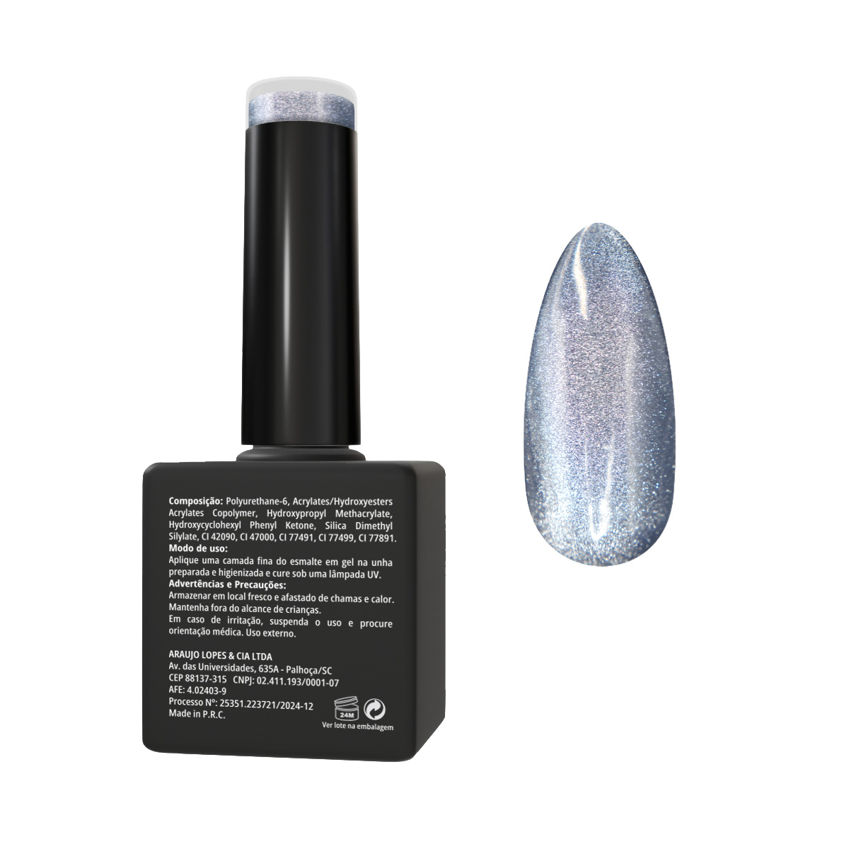 Azul acinzentado metálico com reflexos magnéticos prateados. Esmalte em gel efeito Cat Eye, livre de HEMA, TPO e TMTPA, que possibilita criar efeitos tridimensionais exclusivos com o uso do ímã antes da catalisação.