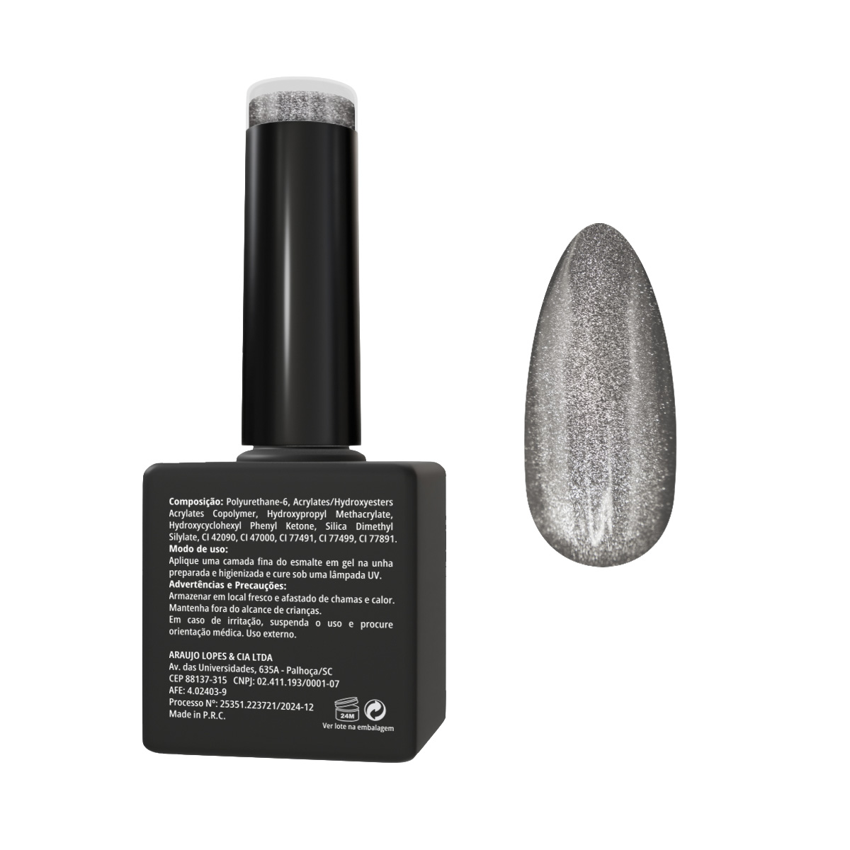 Cinza grafite metálico com reflexos magnéticos prateados. Esmalte em gel efeito Cat Eye, livre de HEMA, TPO e TMTPA, que permite criar efeitos tridimensionais únicos com o uso do ímã antes da catalisação.