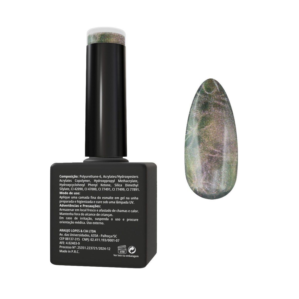 Verde esmeralda cintilante com reflexos metálicos magnéticos. Esmalte em gel efeito Cat Eye, livre de HEMA, TPO e TMTPA, que pode ser usado puro ou sobre outra cor de base, criando efeitos únicos que mudam conforme a luz e o fundo aplicado.
