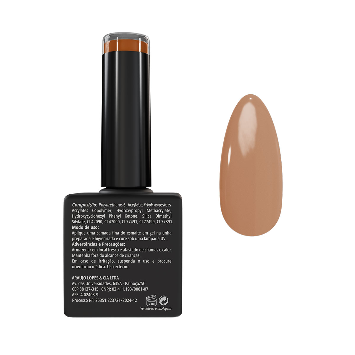 Aplique uma camada fina do esmalte em gel na unha previamente preparada e higienizada. Em seguida, cure sob lâmpada UV por 60 a 120 segundos, conforme a potência do seu equipamento. Para garantir o acabamento perfeito e a durabilidade do serviço, aplique uma segunda camada fina e finalize com top coat, selando e protegendo o design.