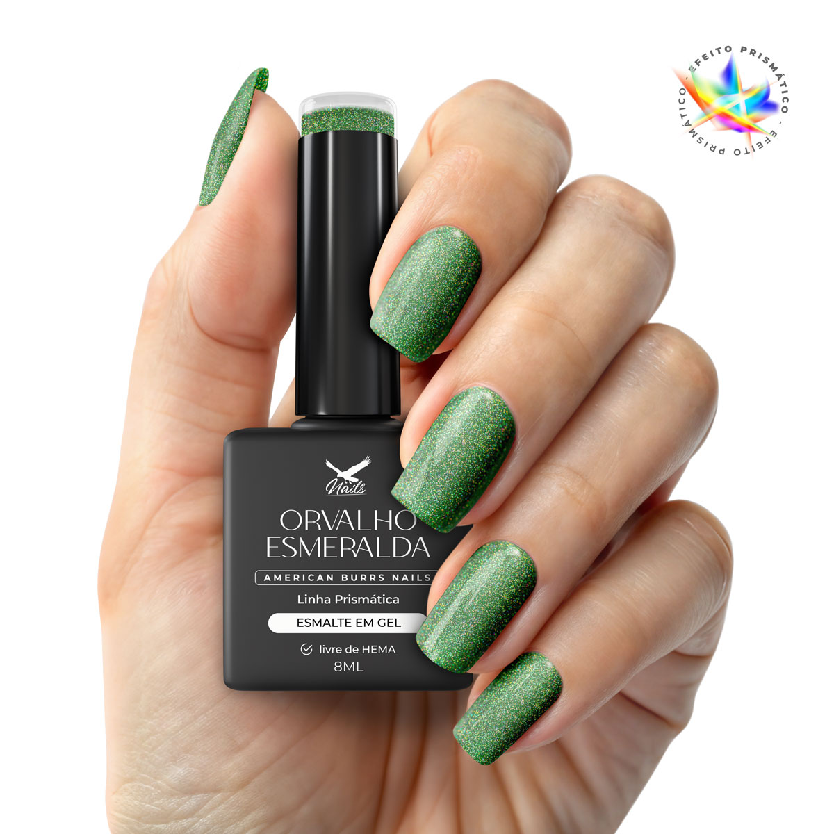 Orvalho Esmeralda: Verde esmeralda refrescante com partículas prismáticas, evocando um visual luxuoso e natural.