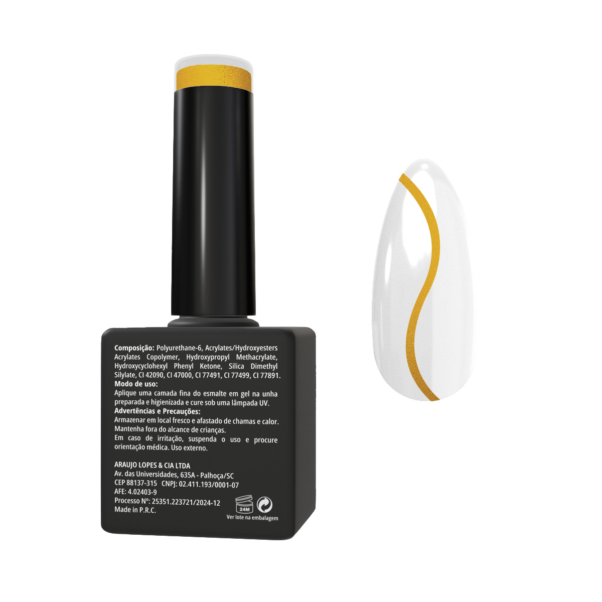Aplique o esmalte em gel liner na unha previamente preparada e higienizada, utilizando o pincel integrado para criar os desenhos desejados. Em seguida, cure sob lâmpada UV por 60 a 120 segundos, conforme a potência do seu equipamento. Para garantir o acabamento perfeito e a durabilidade do serviço, finalize com top coat, selando e protegendo o design.