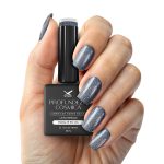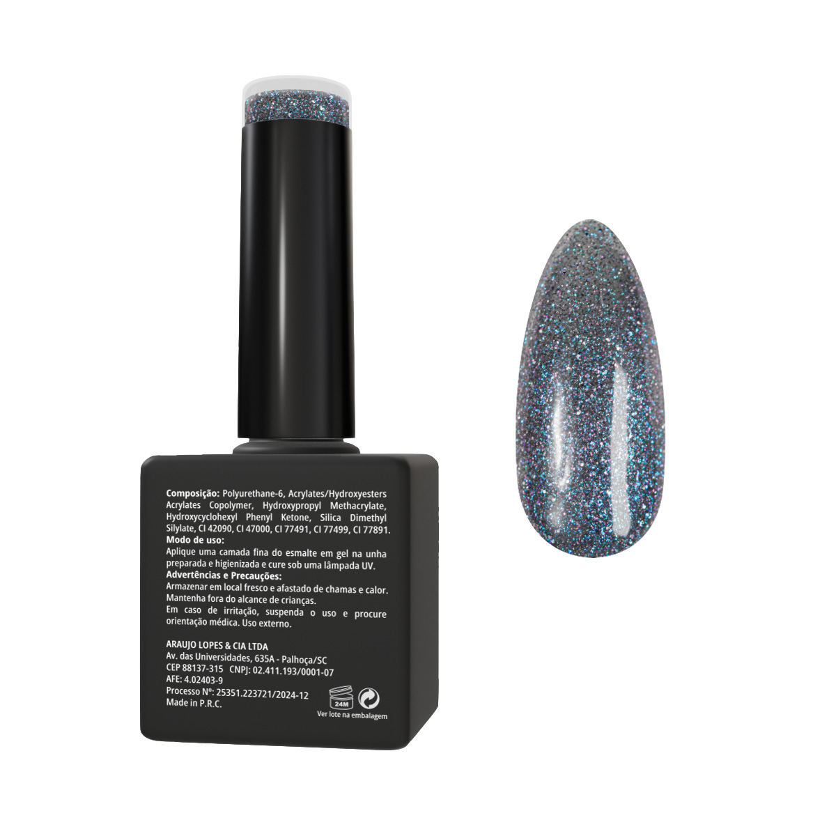 Arroxeado cósmico com partículas reflexivas azul-violeta. Esmalte em gel de alta performance, livre de HEMA, TPO e TMTPA, com aplicação autonivelante, segurança máxima e brilho multidimensional desde a primeira camada.
