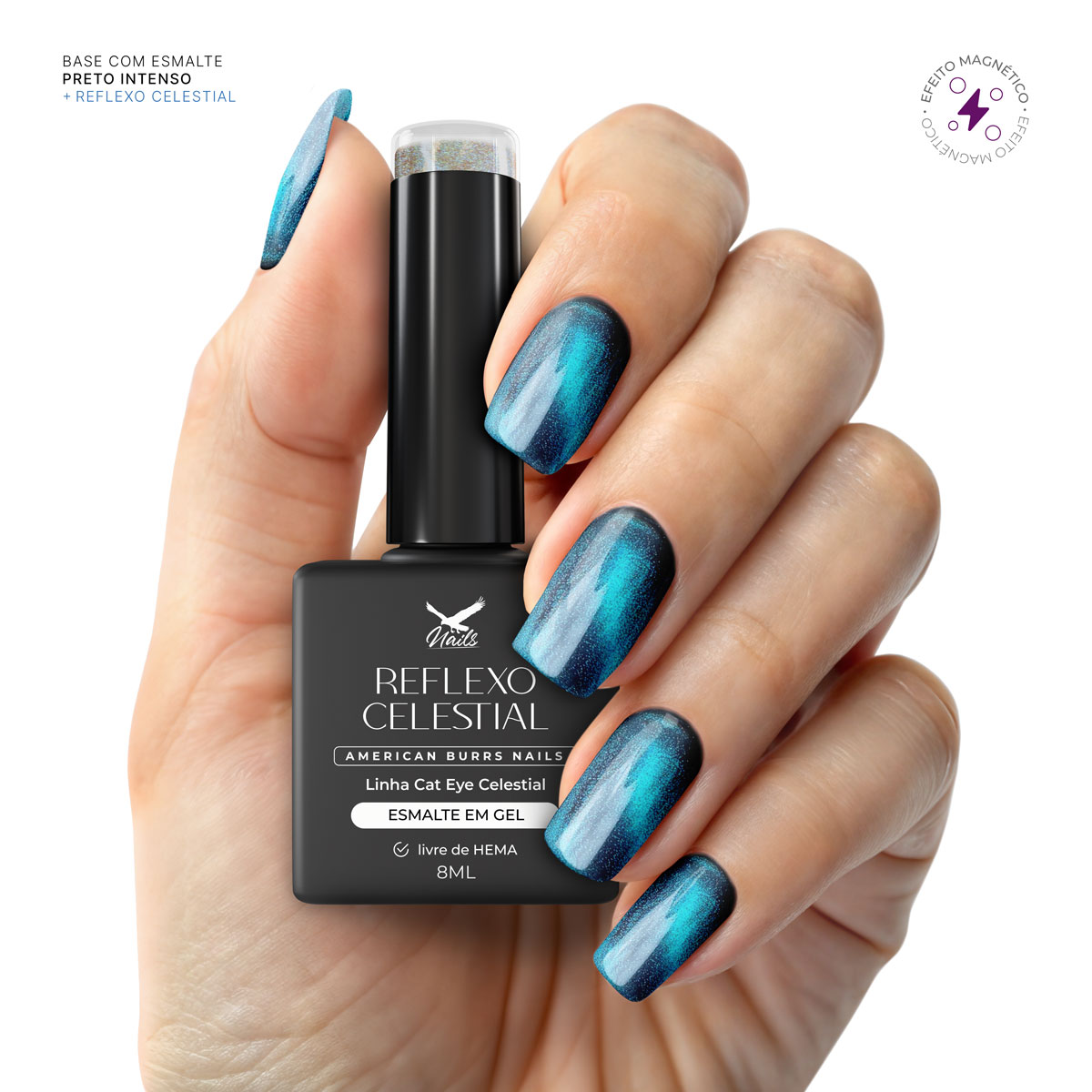 Sobre a cor – Reflexo Celestial: Um vibrante e profundo azul ciano, lembrando uma nebulosa distante. O efeito magnético intensifica a cor, criando um feixe luminoso azul celeste que parece capturar um fragmento do céu nas unhas.