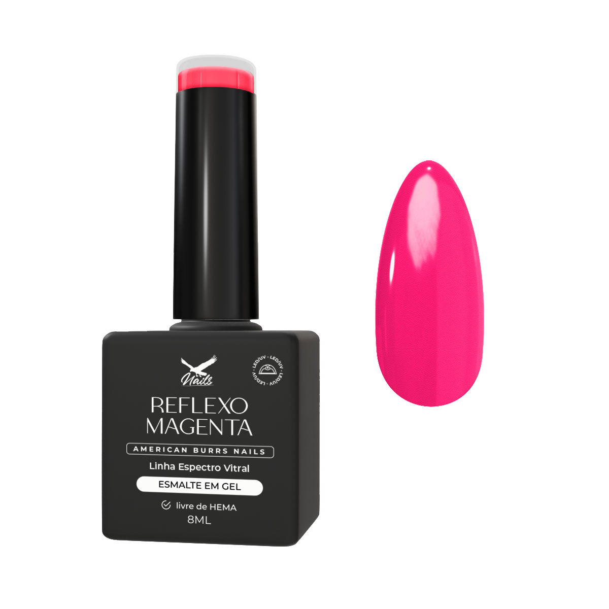 Um rosa puro de intensidade luminosa, com acabamento translúcido que remete a vidro colorido. Reflexo Magenta é ideal para realçar nail arts criativas, sobreposições delicadas ou ser usado puro para um visual moderno e impactante.
