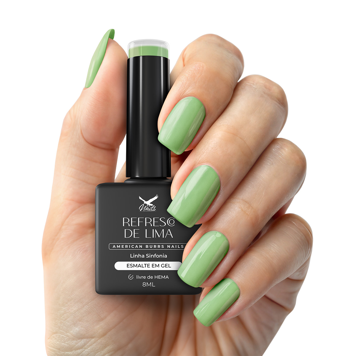 Verde lima pastel vibrante com fundo amarelado e acabamento cremoso. Esmalte em gel de alta performance, livre de HEMA, TPO e TMTPA, com aplicação autonivelante, cobertura uniforme e longa durabilidade.