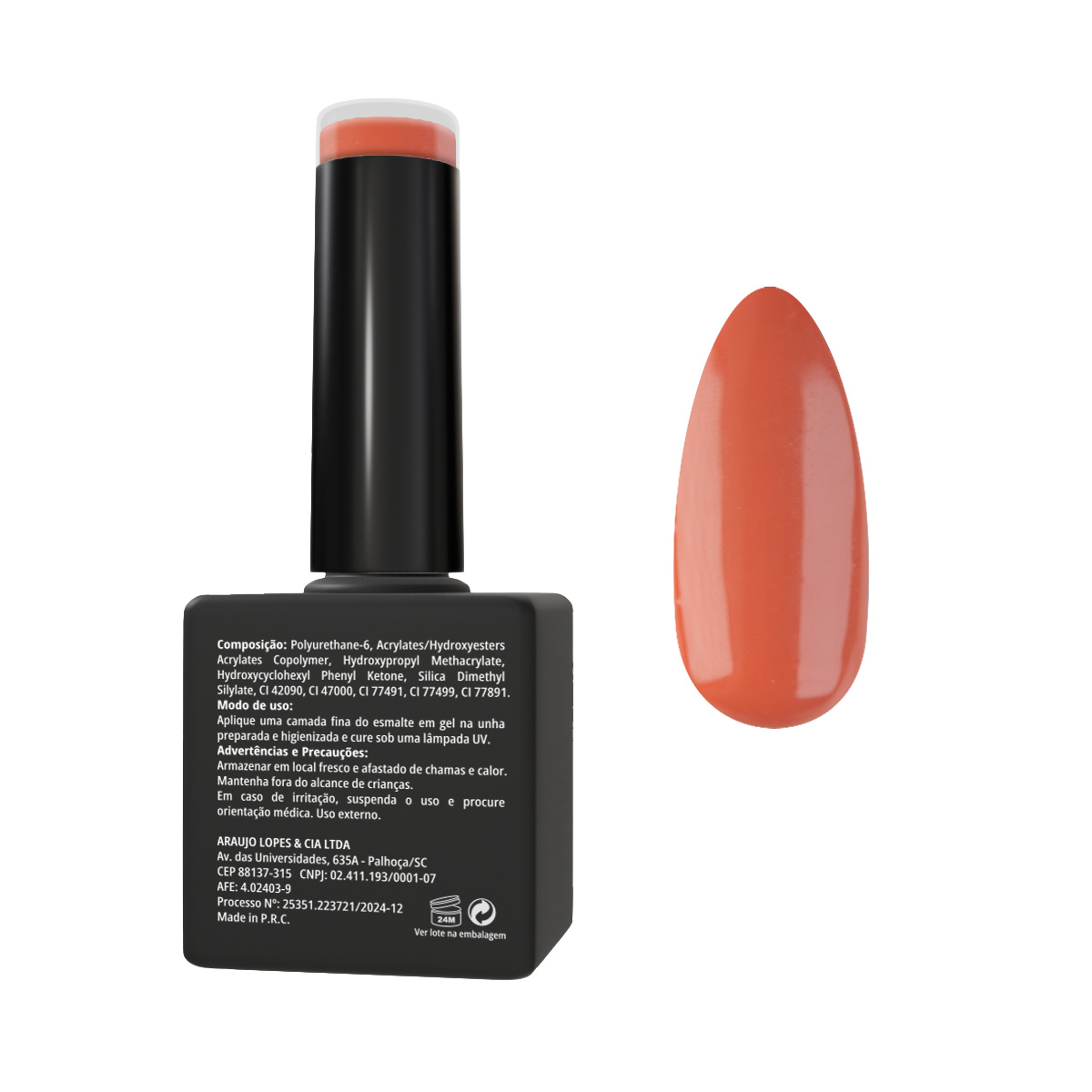 Terracota médio com fundo quente e acabamento cremoso. Esmalte em gel de alta performance, livre de HEMA, TPO e TMTPA, com aplicação autonivelante, cobertura uniforme e fixação prolongada.