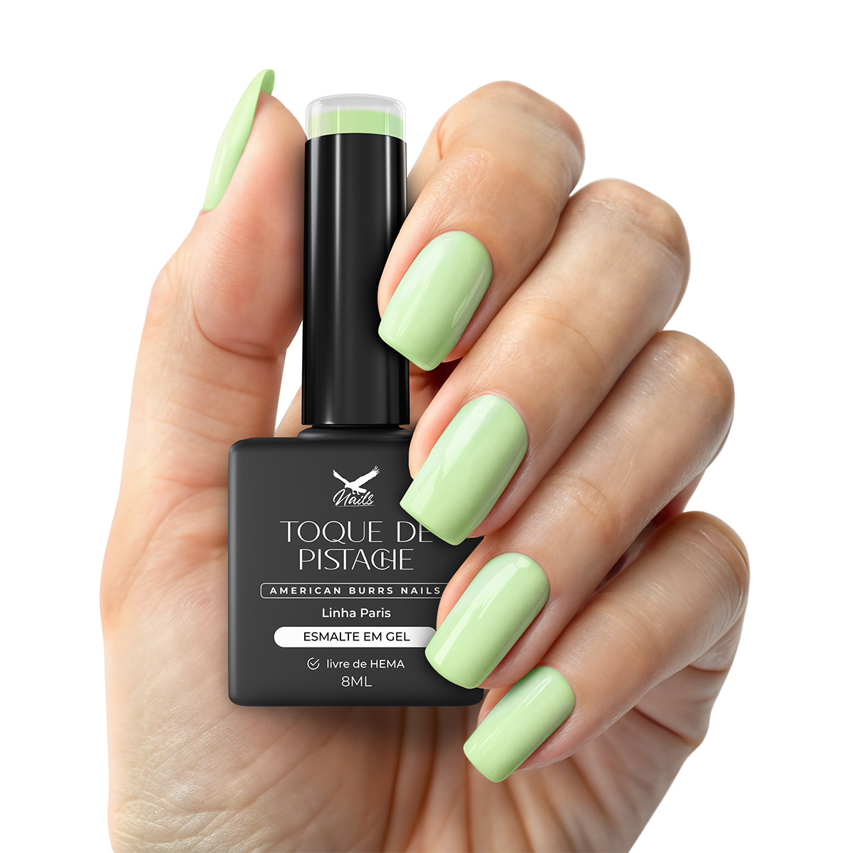 Verde pistache pastel com fundo levemente frio e acabamento cremoso. Esmalte em gel de alta performance, livre de HEMA, TPO e TMTPA, com aplicação autonivelante, segurança máxima e cor vibrante desde a primeira camada.
