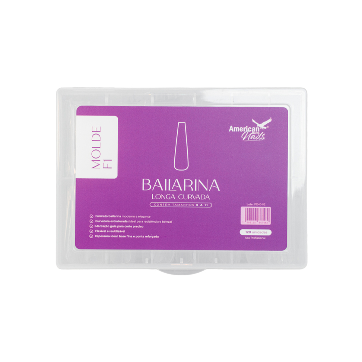 - Formato Bailarina pré-moldado, ideal para clientes que amam unhas sofisticadas, longas e com a ponta levemente afunilada e reta.
