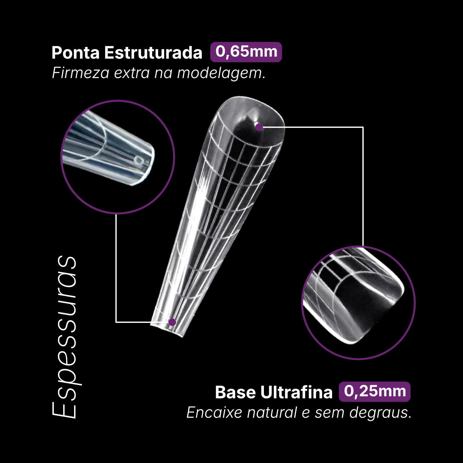 - Espessura Ideal e Anatômica: A base do molde (área da cutícula) possui espessura fina de 0.25mm, promovendo um encaixe suave e confortável que não machuca a cliente, enquanto a ponta conta com 0.65mm de espessura para garantir a firmeza necessária durante a modelagem.