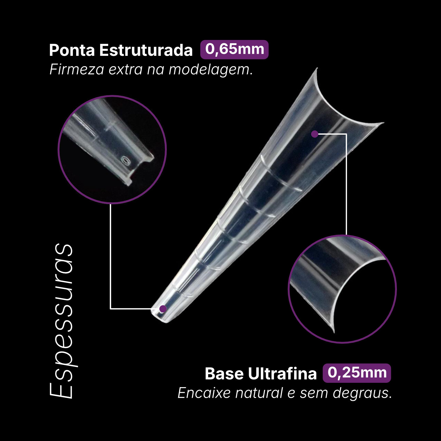 - Arquitetura Extrema com Espessura Inteligente: A base do molde possui 0.25mm para um encaixe nivelado e suave na zona da cutícula, enquanto a ponta conta com 0.65mm de espessura. Isso garante que o formato alongado e pontiagudo não dobre ou deforme durante a construção da unha.
