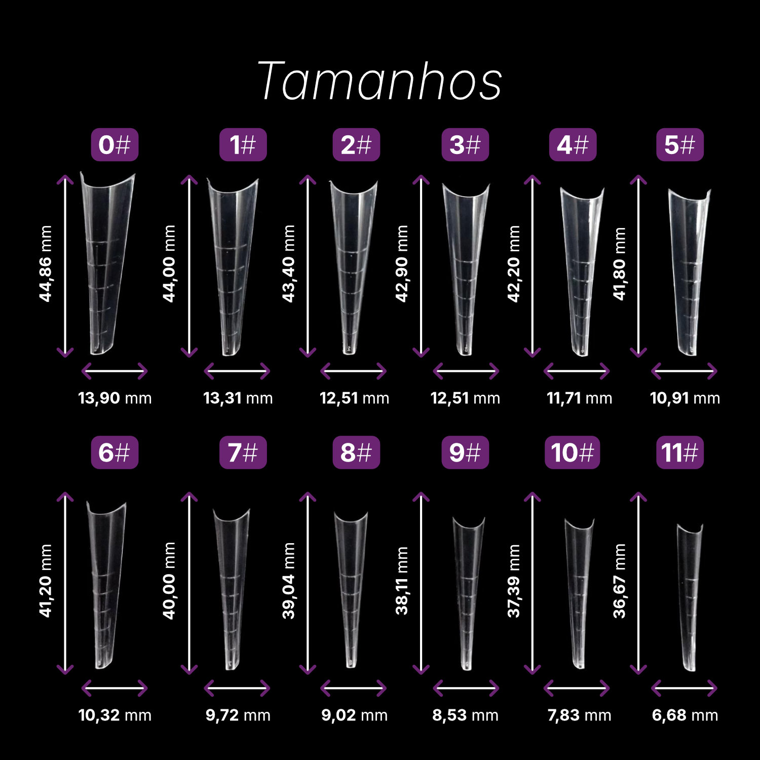 - Personalização e Encaixe: A caixa conta com 12 tamanhos variados (numerados do 0# ao 11#), permitindo a adaptação estrutural perfeita para qualquer formato de leito ungueal.