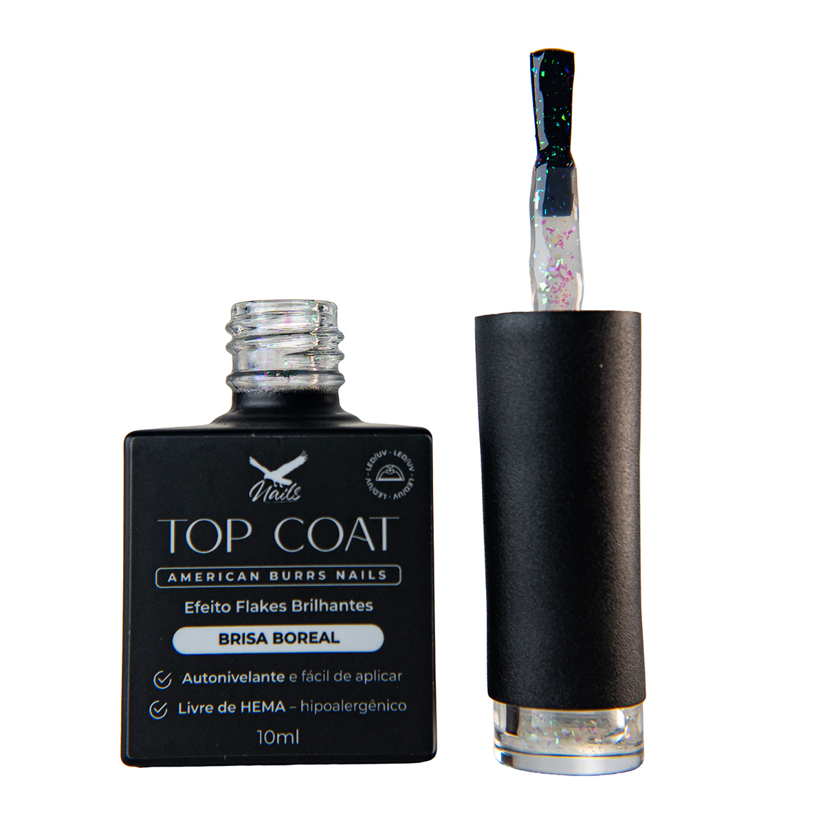 O Top Coat Brisa Boreal foi desenvolvido para unir proteção avançada, brilho intenso e efeito visual exclusivo. Sua fórmula de última geração proporciona acabamento cristalino e resistente, com partículas flakes que refletem nuances azuis e verdes, criando uma camada luminosa que transforma qualquer esmaltação em uma verdadeira joia.