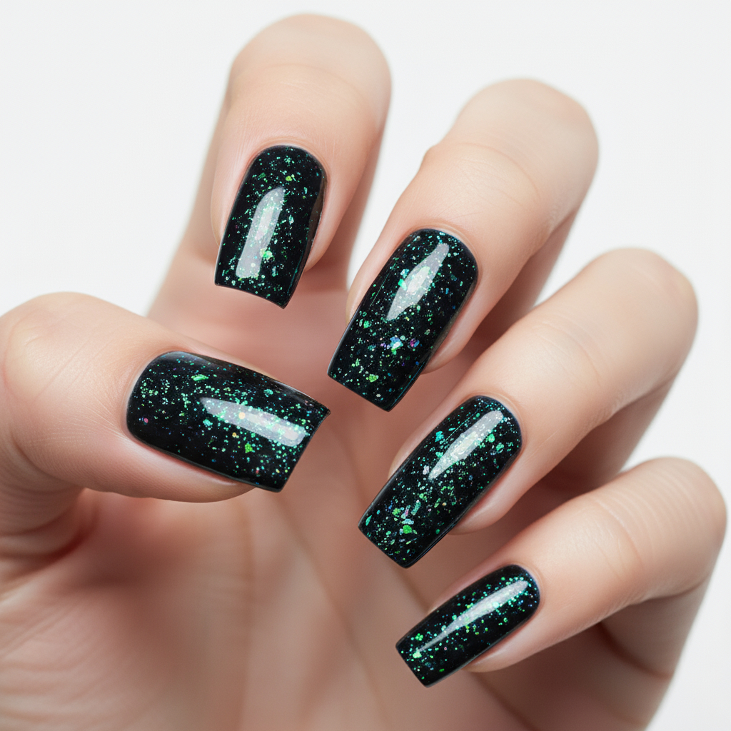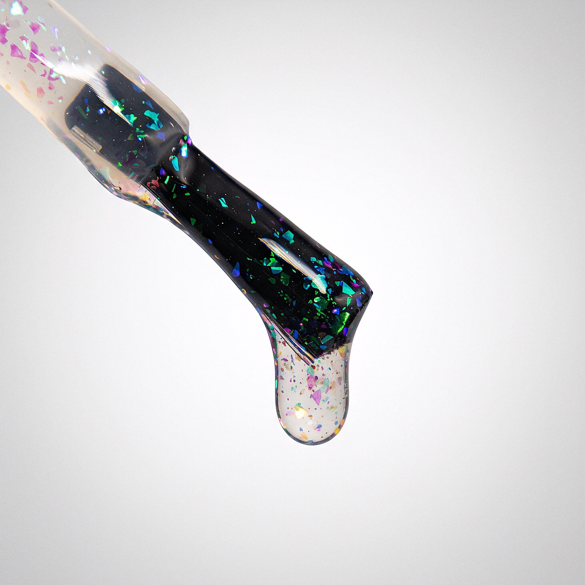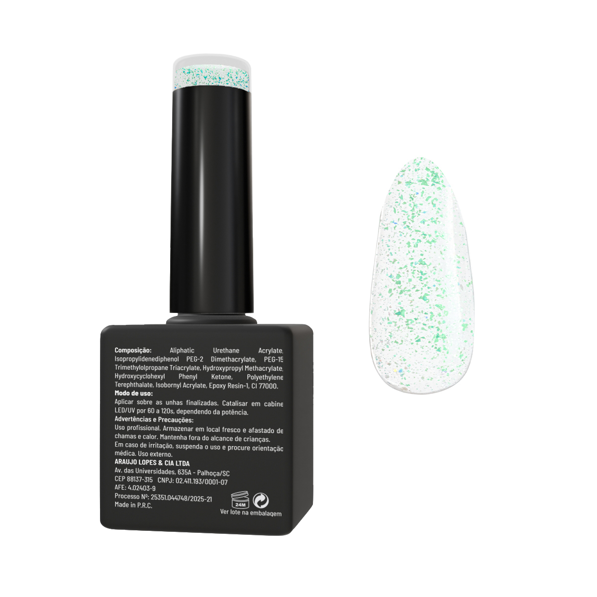 Finalizador sem goma, totalmente livre de HEMA, TPO e TMTPA, com flakes iridescentes em tons azulados e esverdeados. Um toque sofisticado para unhas modernas, cristalinas e de longa duração.