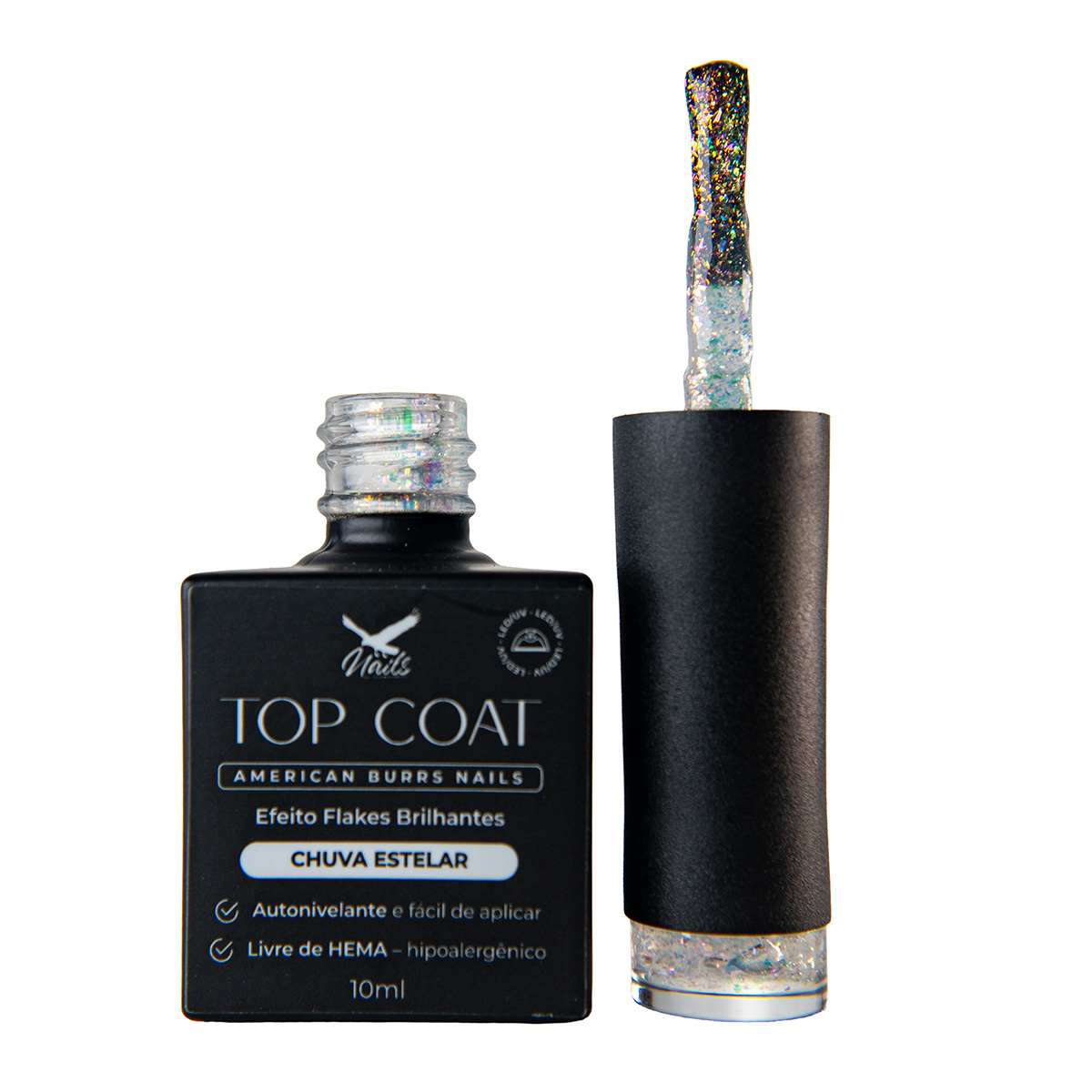 O Top Coat Chuva Estelar traz um acabamento ousado e sofisticado, com partículas flakes multicoloridas que lembram estrelas brilhando no céu noturno. Sua tecnologia garante brilho intenso, durabilidade prolongada e resistência contra arranhões, mantendo a esmaltação impecável por semanas.