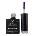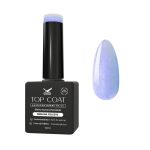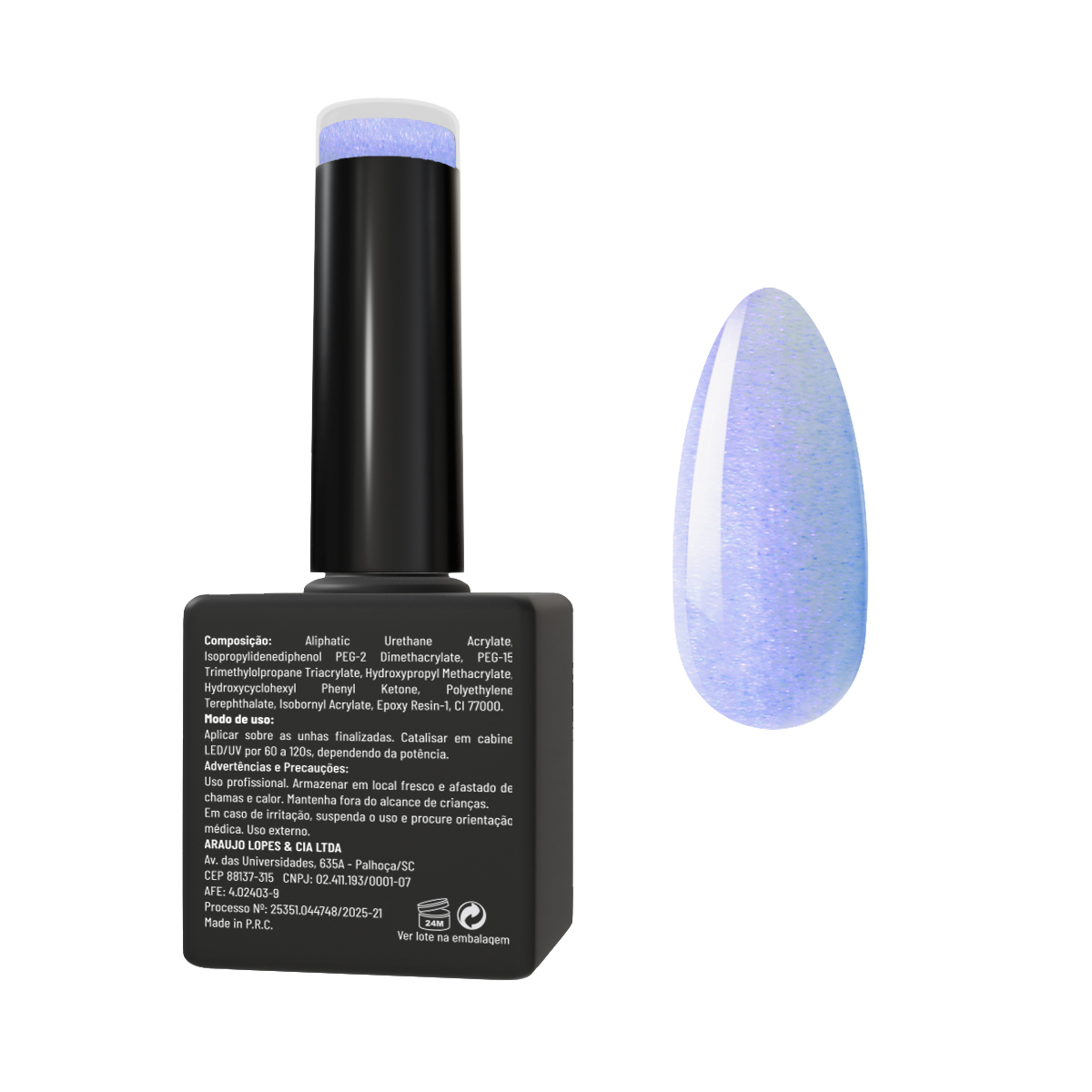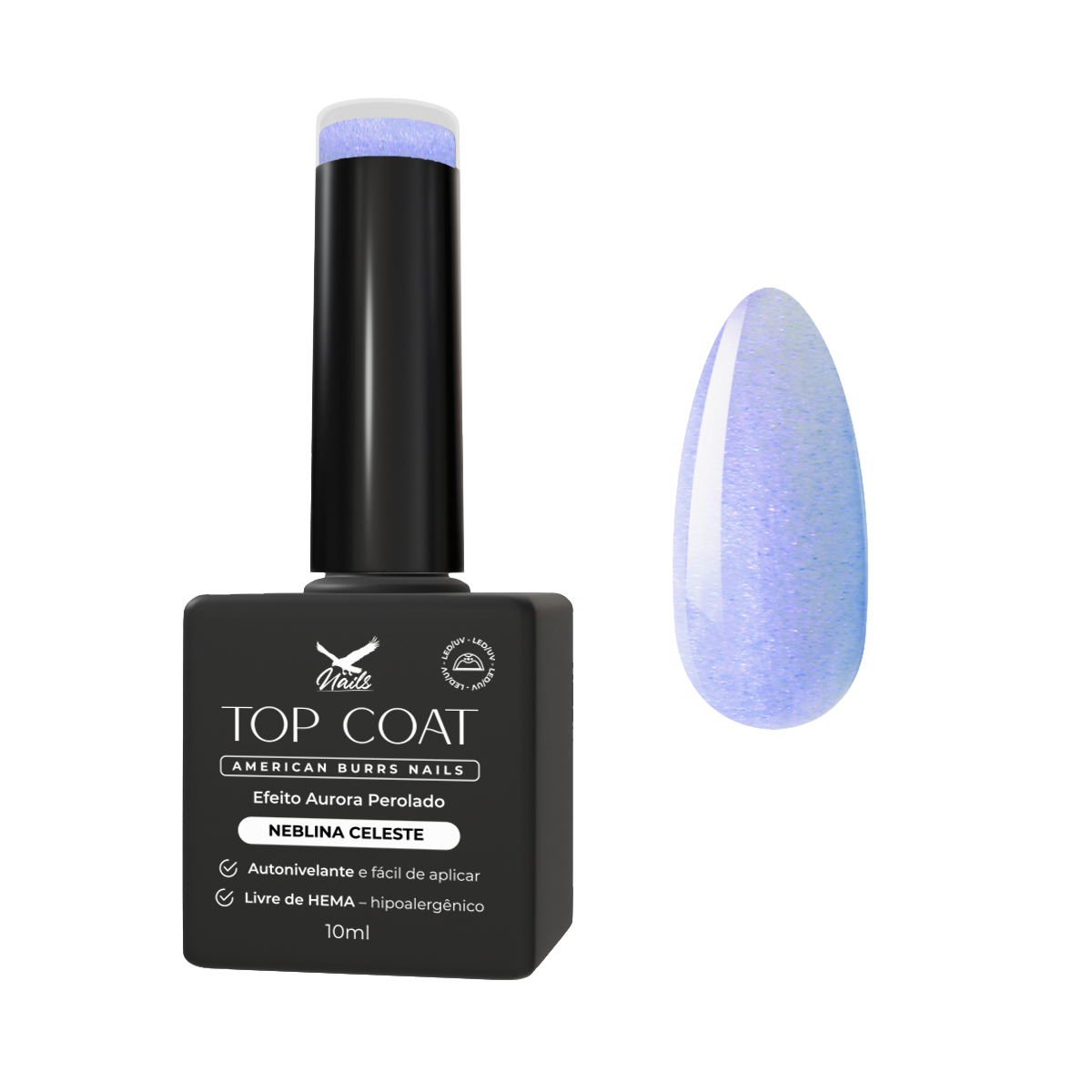 Top Coat sem goma, totalmente livre de HEMA, TPO e TMTPA, com efeito aurora perolado em tons azulados e lilases, criando um acabamento sofisticado, delicado e único.