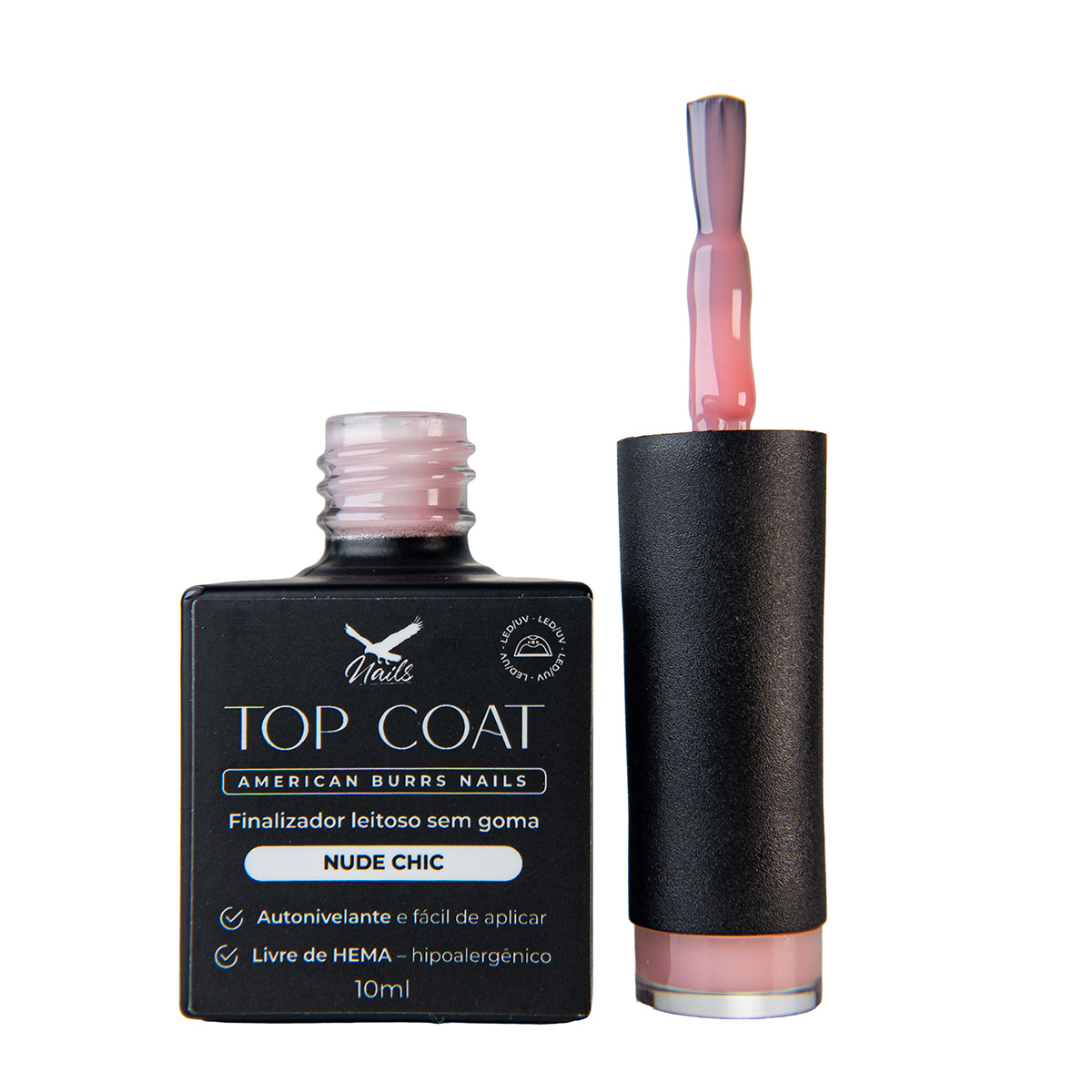 Top Coat leitoso sem goma, totalmente livre de HEMA, TPO e TMTPA, para finalização segura e sofisticada.